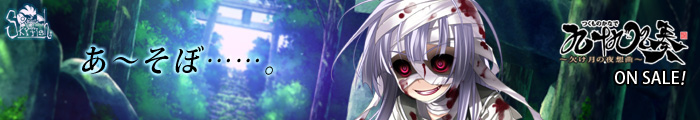 <a href="http://www.sky-fish.jp/" target="_blank"><img src="http://www.sky-fish.jp/tsukumo/banner/tsukumo_bn700x120-02.jpg" width="700" height="120" border="0" alt="SkyFish最新作『九十九の奏〜欠け月の夜想曲〜』を応援しています!!"></a>